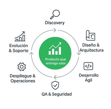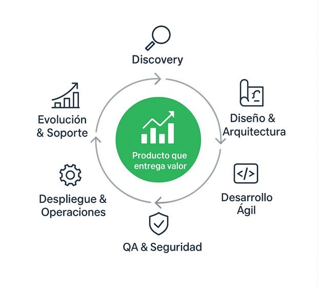 Trabajamos con metodologías ágiles y estándares profesionales que aseguran trazabilidad, calidad y entrega de valor: